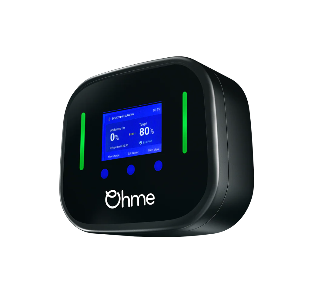 Featuring a clear, bright LCD screen, Ohme Home Pro displays live charging information and provides users with the option to control their EV charging from the charger itself or via the Ohme app.